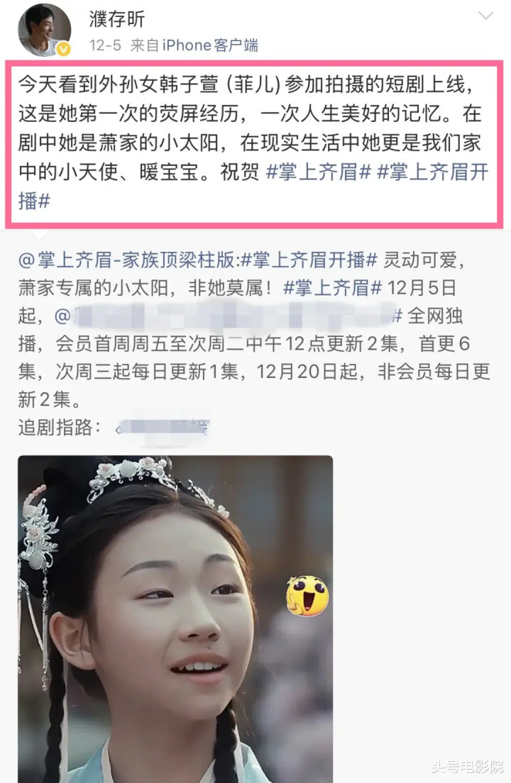 “祝贺#掌上齐眉# #掌上齐眉开播#”近日,72岁的老戏骨濮存昕在社交平台上连发三条动态,为他11岁的外孙女韩子萱(小名菲儿)的首部短剧造势。